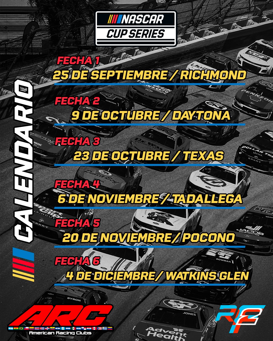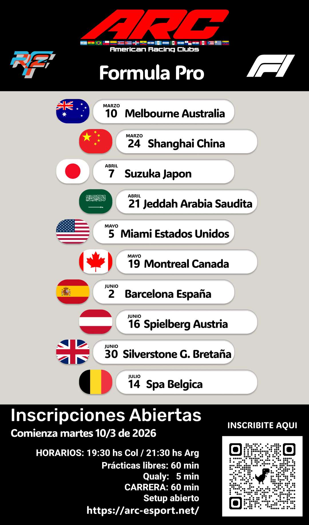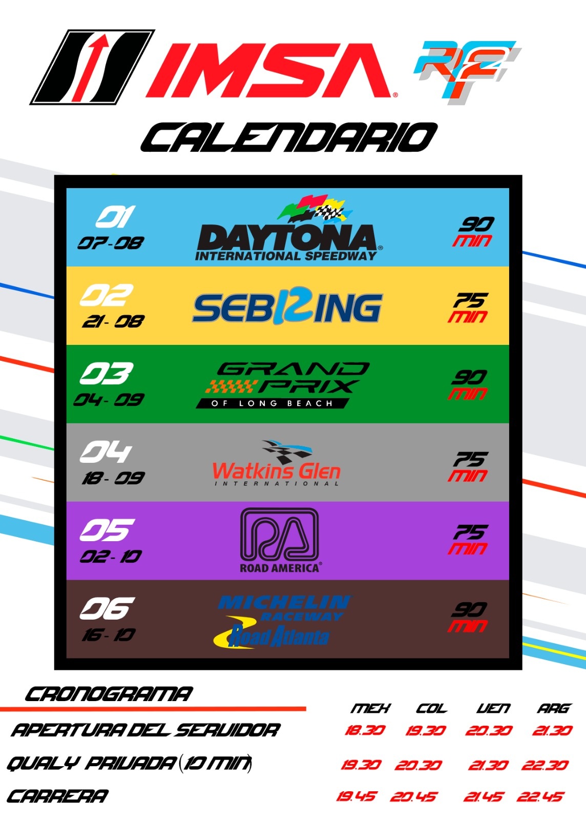 Las carreras serán los días Martes a partir de las 19:30 Horas Col – 21:30 horas Arg-Chi con 1 hora de prácticas libres 15 mins de Qualy en circuitos y 5 mins en Óvalos, dependiendo del circuito se define la cantidad de vueltas.